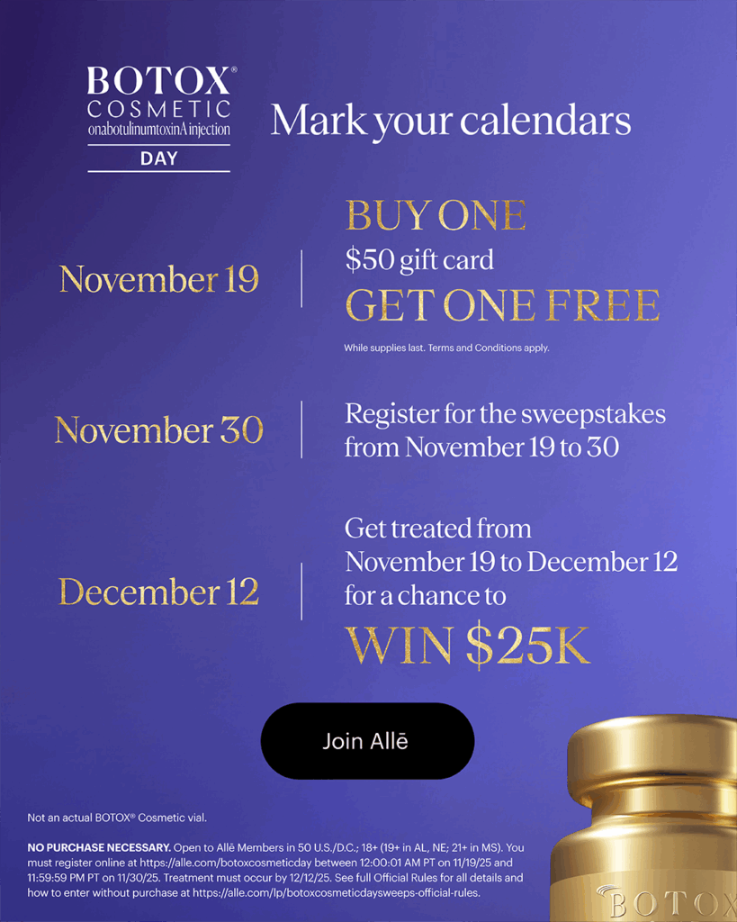 Every November, Allergan celebrates another year of BOTOX® Cosmetic with an incredible Buy One, Get One Gift Card offer. For one day only, Allē® members can purchase a $50 Botox Gift Card and receive a second $50 Gift Card FREE—a $100 value for just $50!