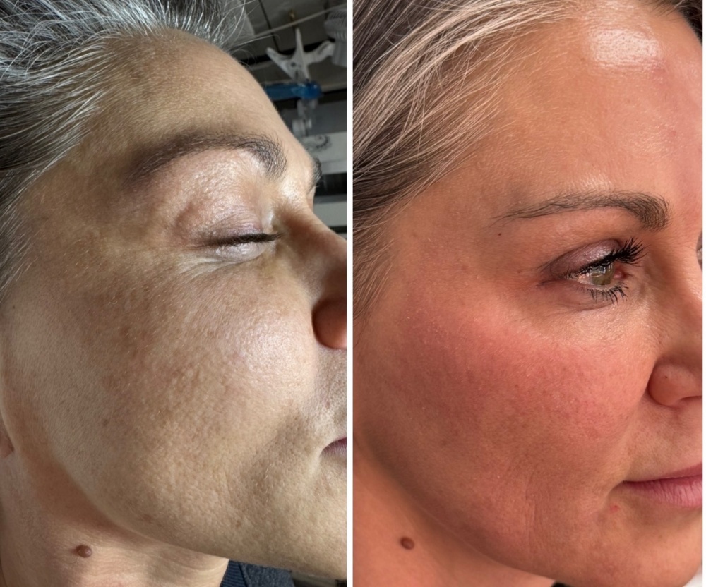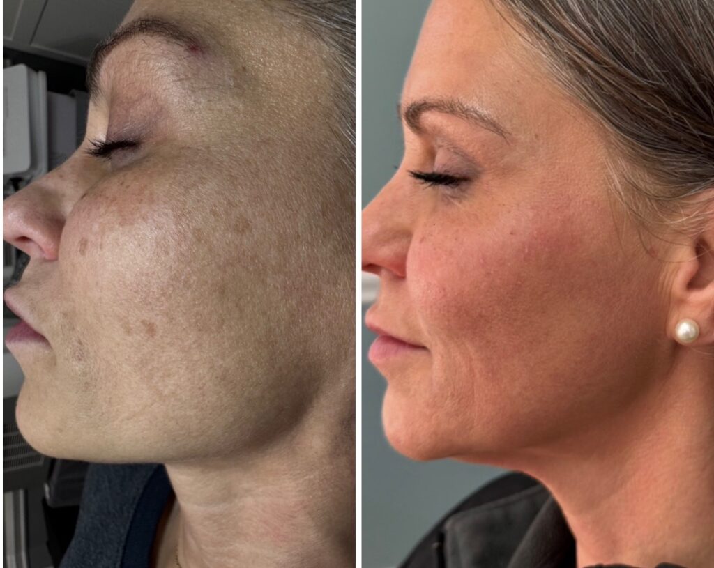 Before and After Looking to the Left. Tighter, clearer skin. Melasma greatly reduced.